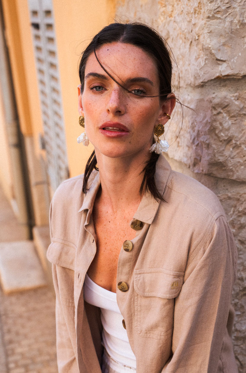 Le design floral des boucles d'oreilles Raymonde associe un clou doré texturé à des pétales nacrés délicats, pour un bijou raffiné et féminin.