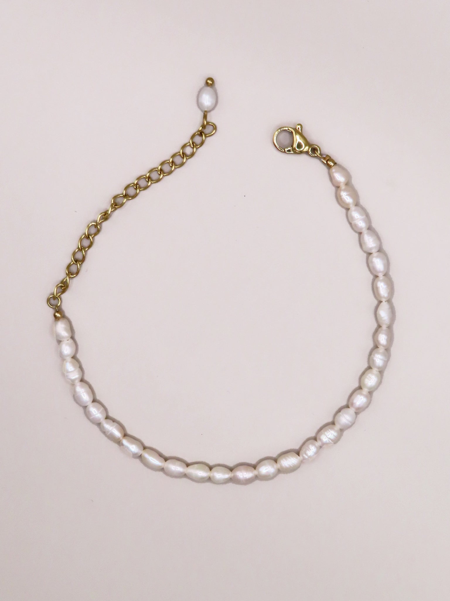 Bracelet en acier inoxydable, perles d'eau douce, taille ajustable, hypoallergénique, résiste à l'eau et ne noircit pas. Disponible en coloris doré.