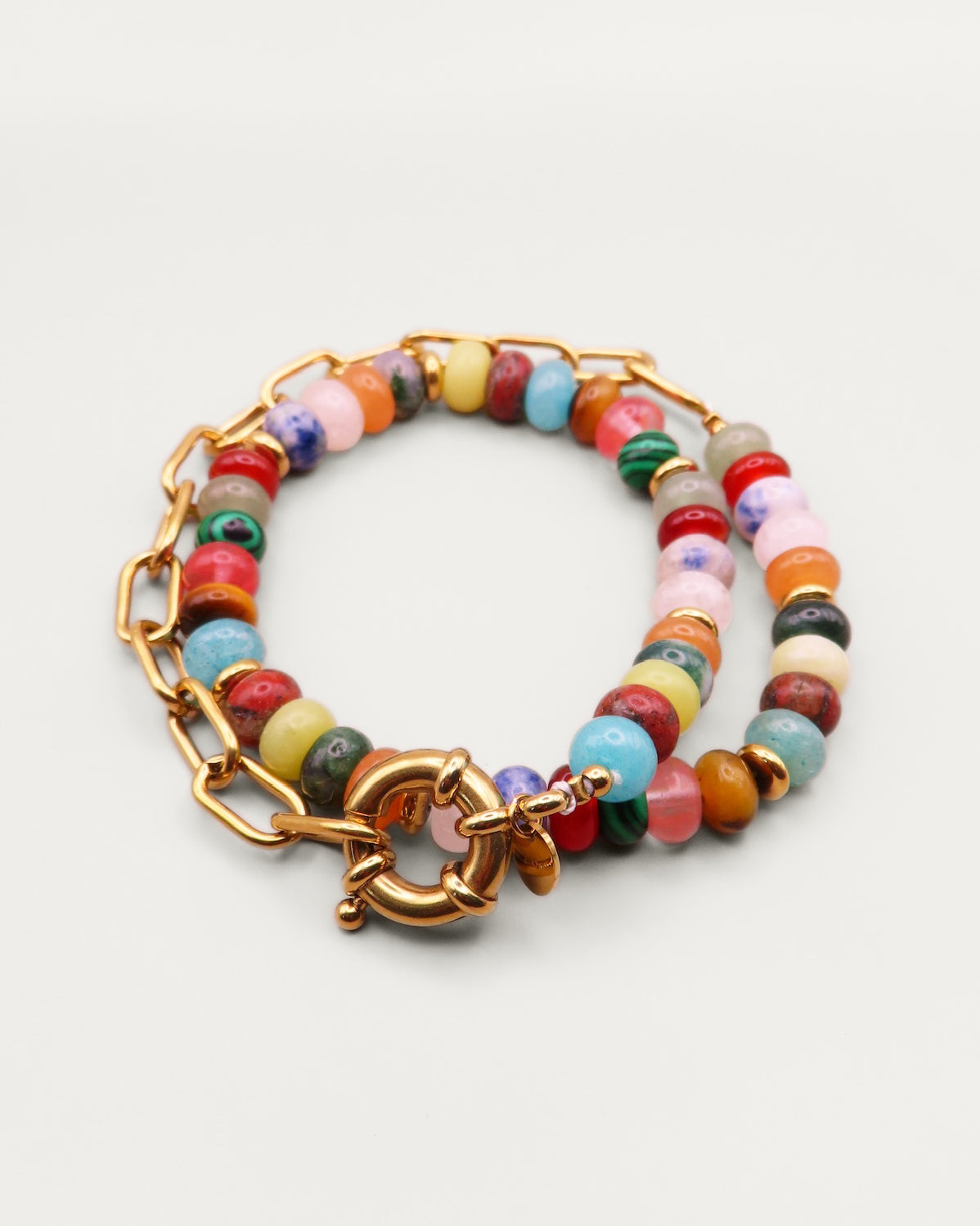 Le bracelet Martine est une célébration de la couleur et de l’élégance. Ses pierres naturelles multicolores apportent une touche vive et moderne, tandis que sa chaîne dorée souligne avec finesse le charme raffiné de votre poignet.