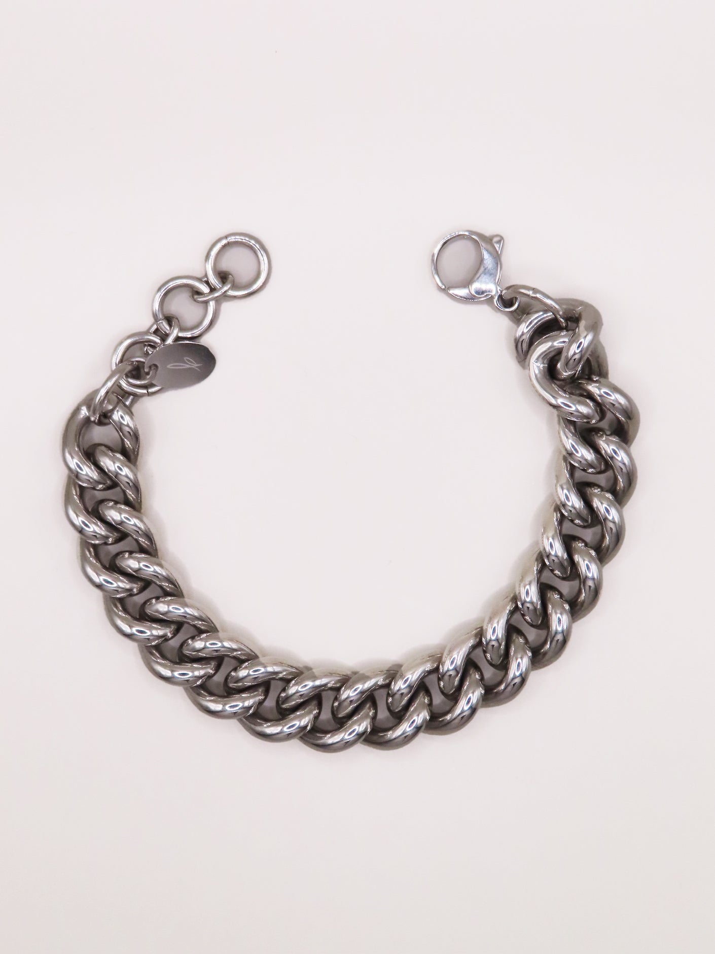 Bracelet en acier inoxydable, taille ajustable, hypoallergénique, résiste à l'eau et ne noircit pas. Disponible en coloris argenté.