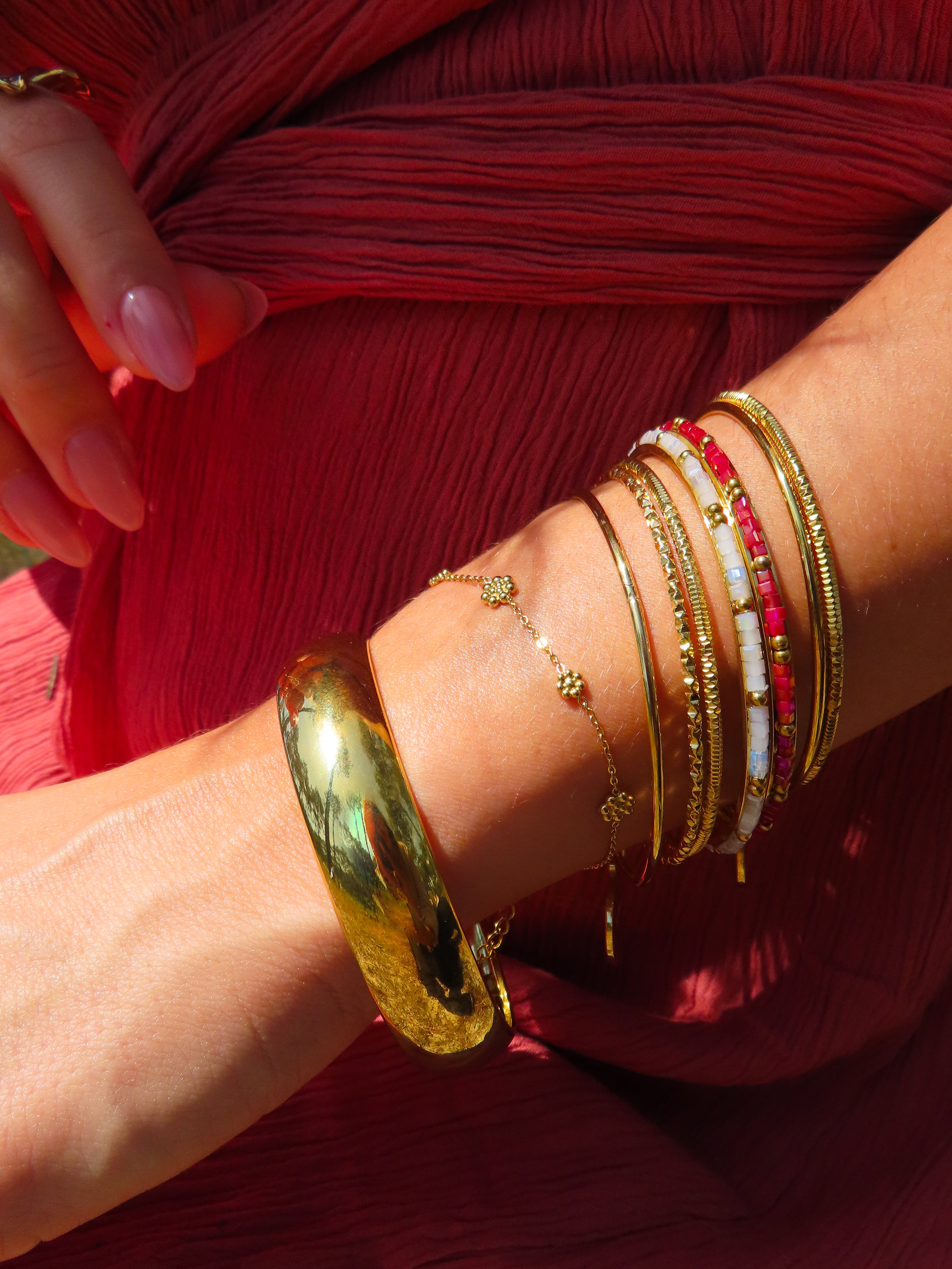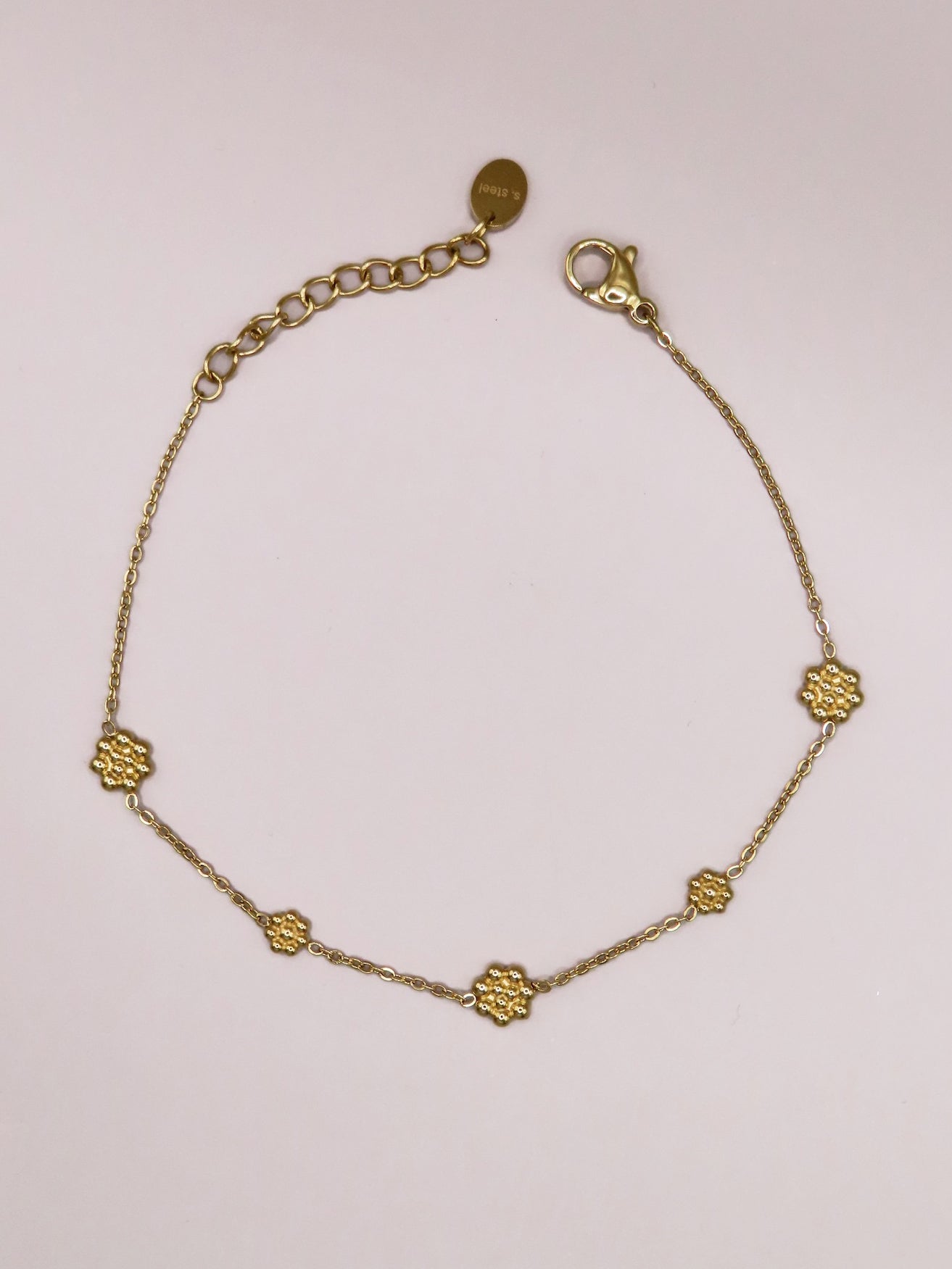 Bracelet en acier inoxydable, taille ajustable, hypoallergénique, résiste à l'eau et ne noircit pas. Disponible en coloris doré.