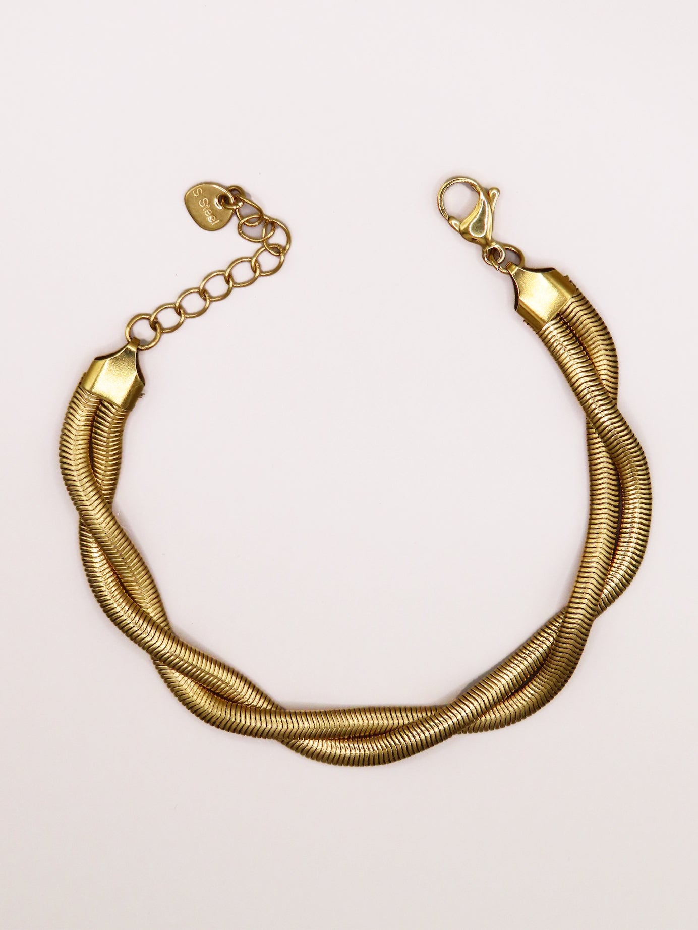 Bracelet en acier inoxydable, taille ajustable, hypoallergénique, résiste à l'eau et ne noircit pas. Disponible en coloris doré.