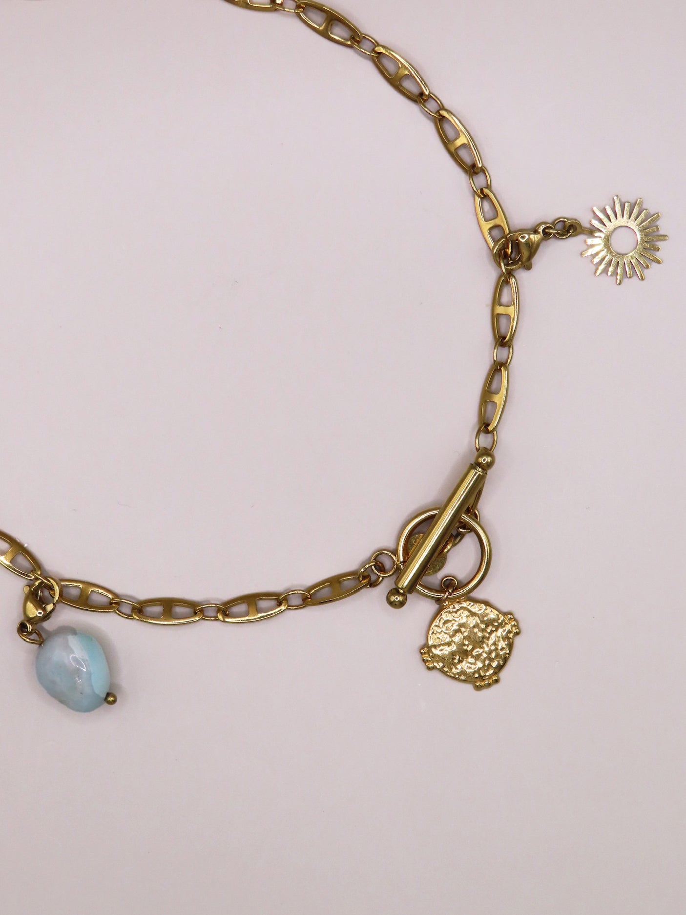 Collier en acier inoxydable et pierre naturelle, longueur ajustable, hypoallergénique, résiste à l'eau et ne noircit pas. Disponible en coloris doré