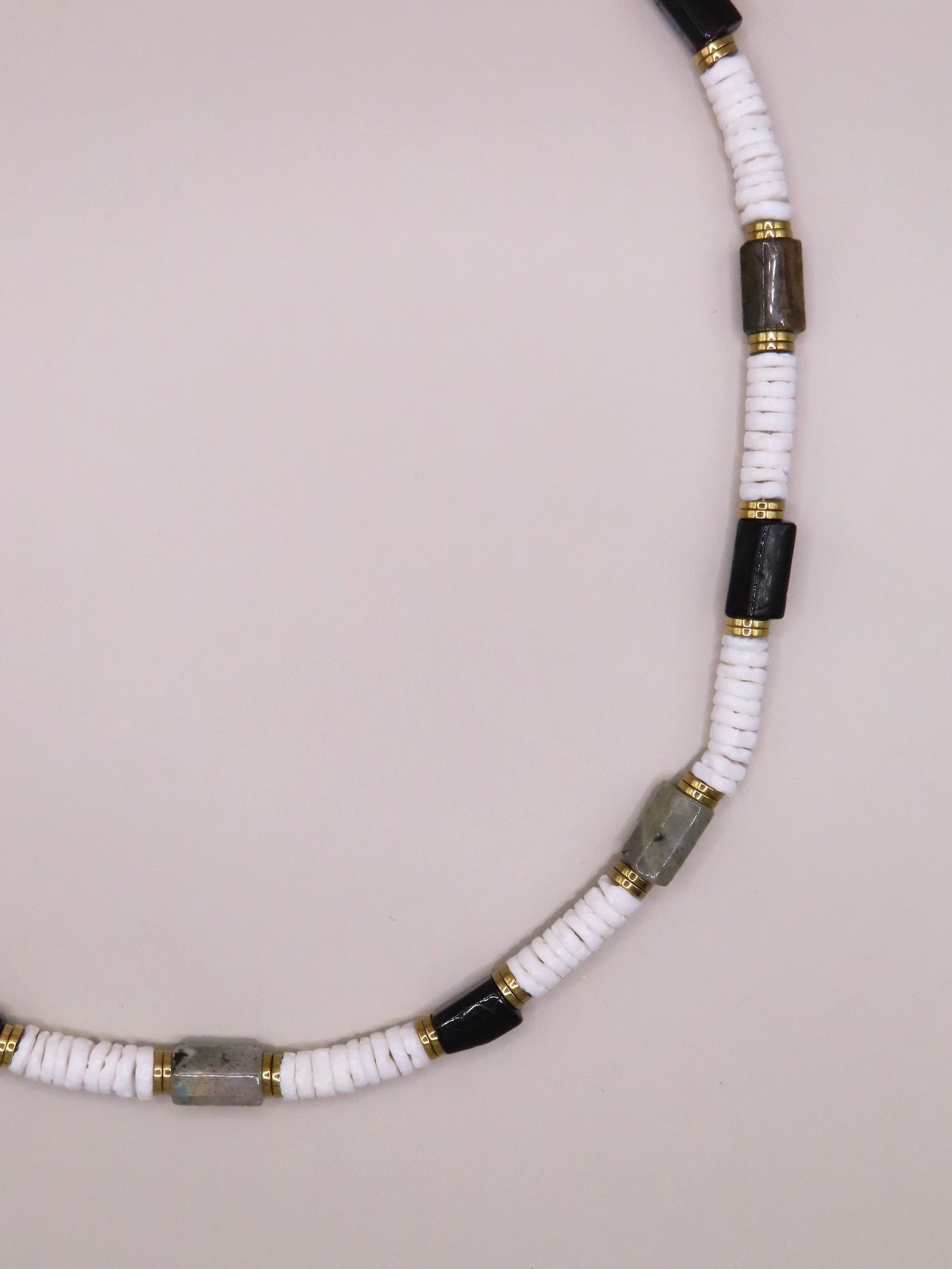 Collier en acier inoxydable et perles naturelles, longueur ajustable, hypoallergénique, résiste à l'eau et ne noircit pas. Disponible en coloris gris.