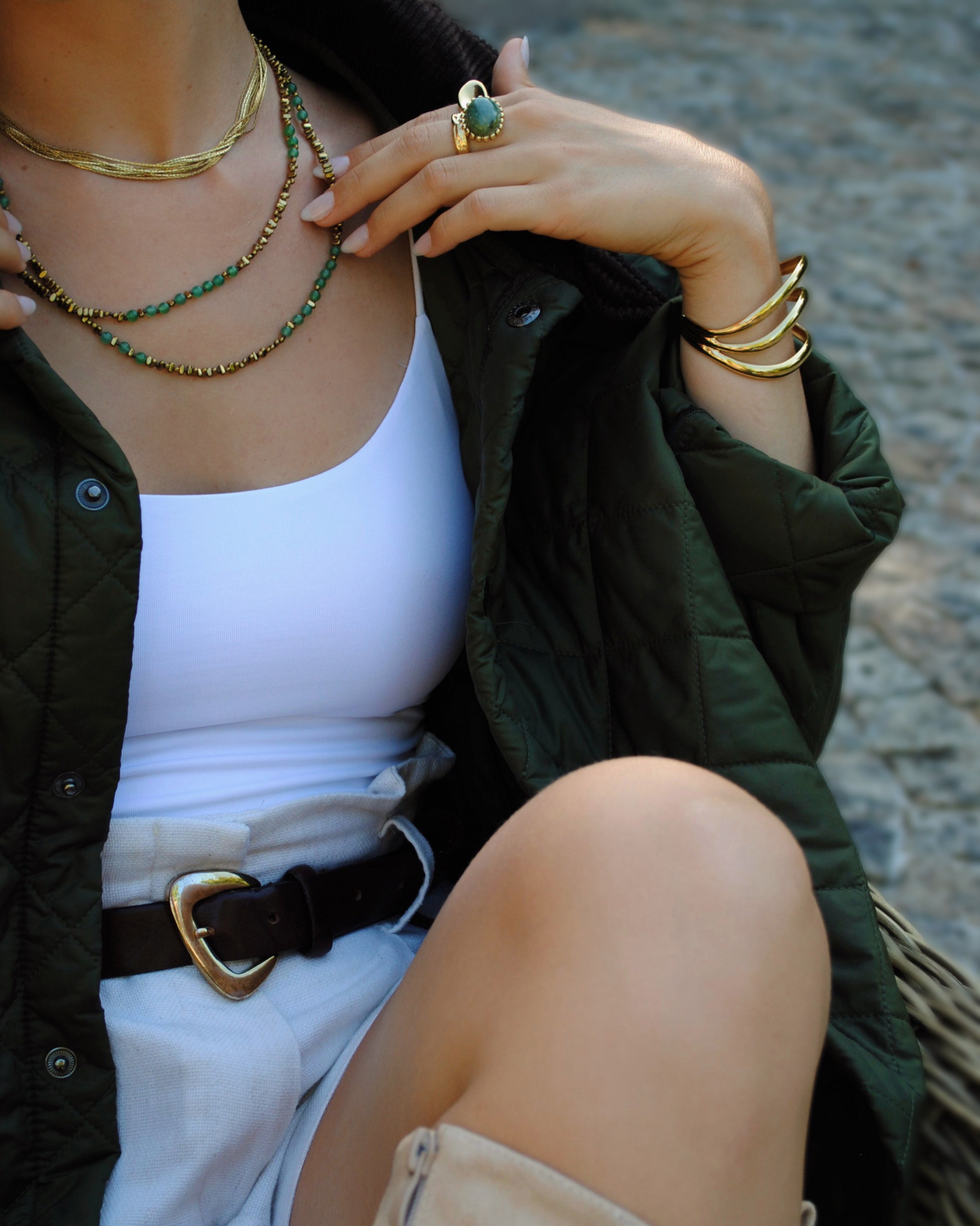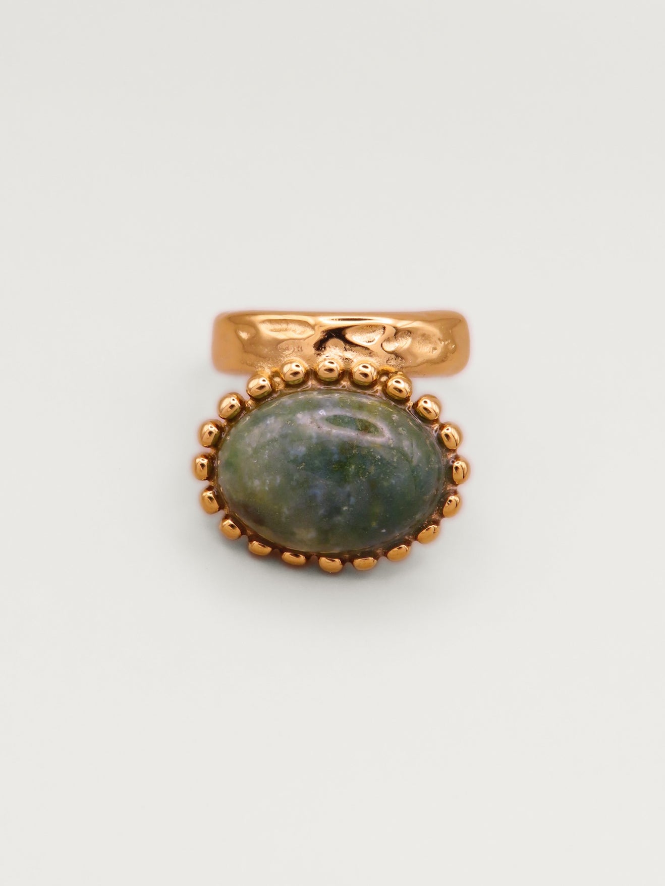Affirmez votre style avec la bague Barbara, ornée d’une pierre naturelle à la teinte chaleureuse, encadrée par un anneau doré délicatement travaillé pour une élégance intemporelle.