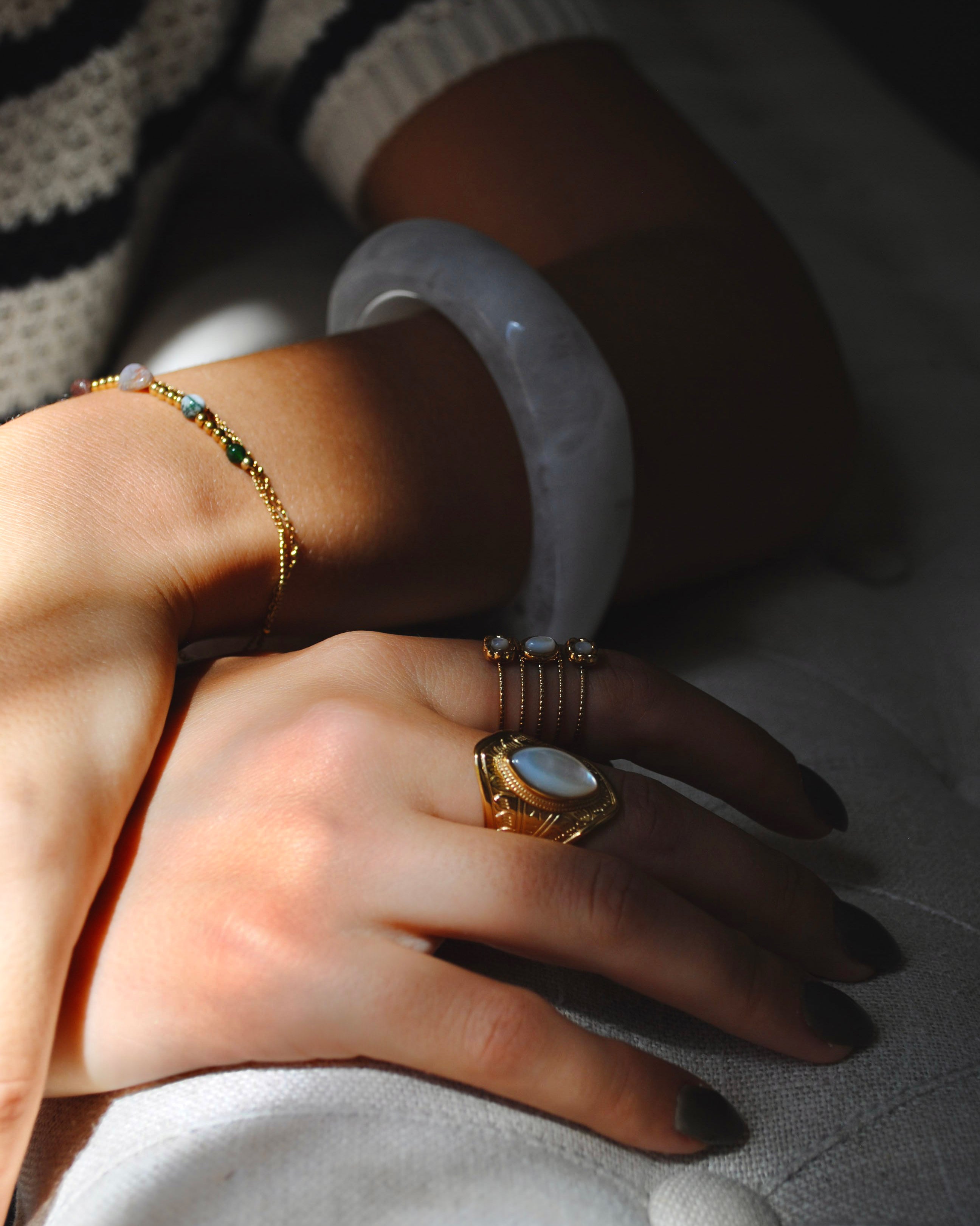 Avec ses lignes ajourées et ses pierres naturelles en délicat contraste, la bague Blandine se porte comme une pièce raffinée et élégante, idéale pour sublimer une tenue sobre ou accentuer un style affirmé.