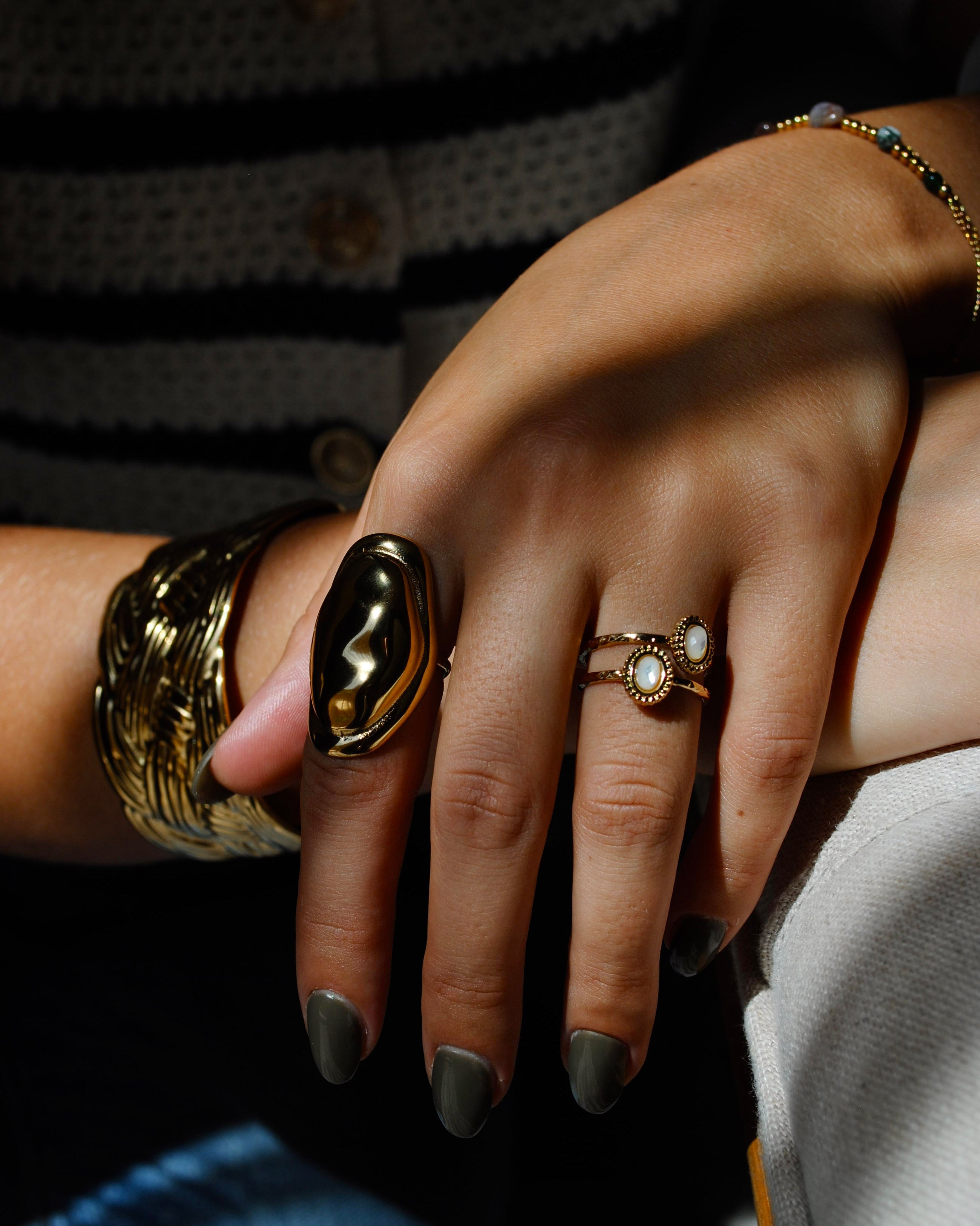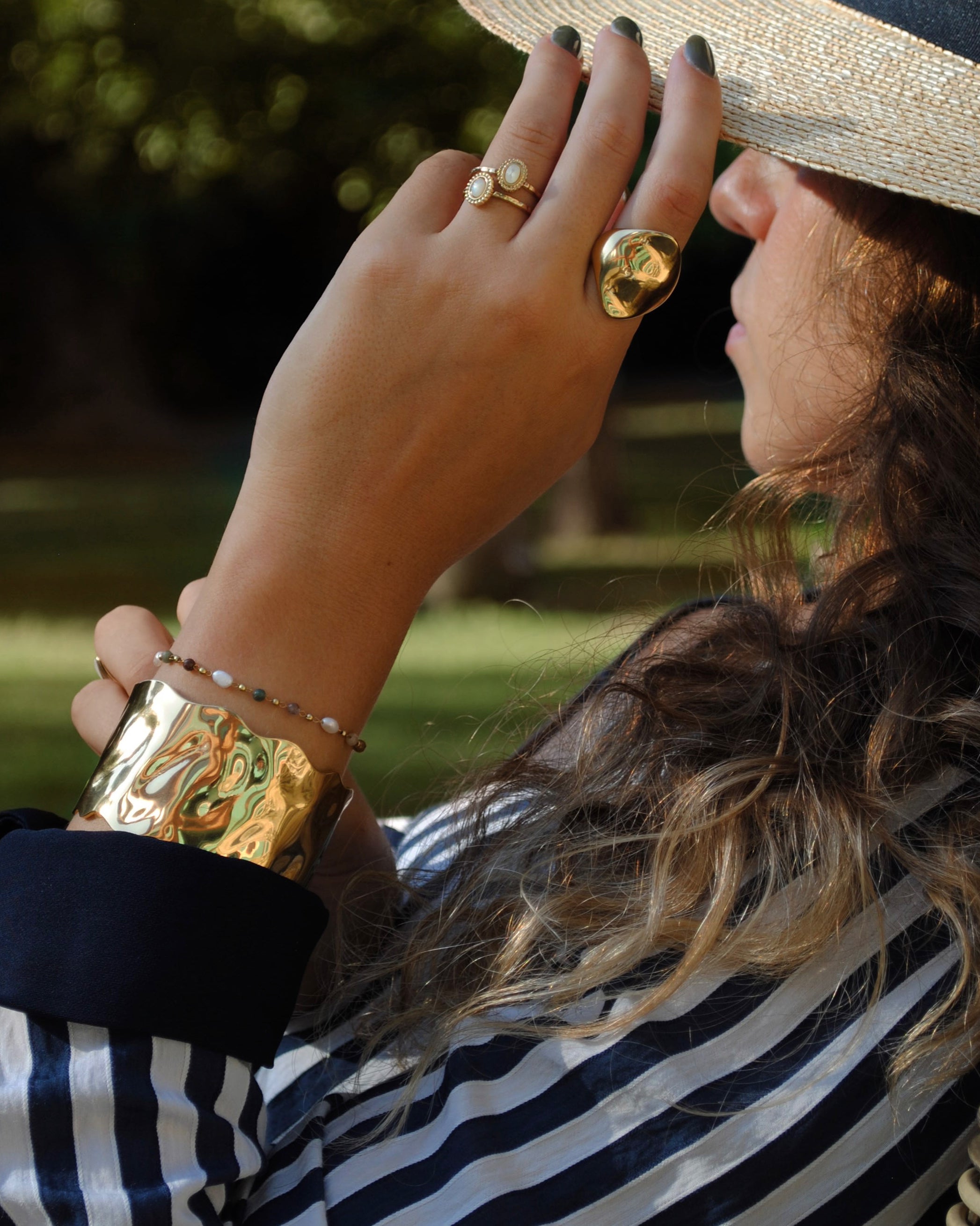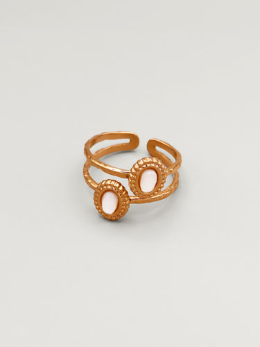 Avec son anneau ajustable rehaussé de deux pierres naturelles nacrées, la bague Esther allie délicatesse et éclat.