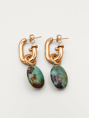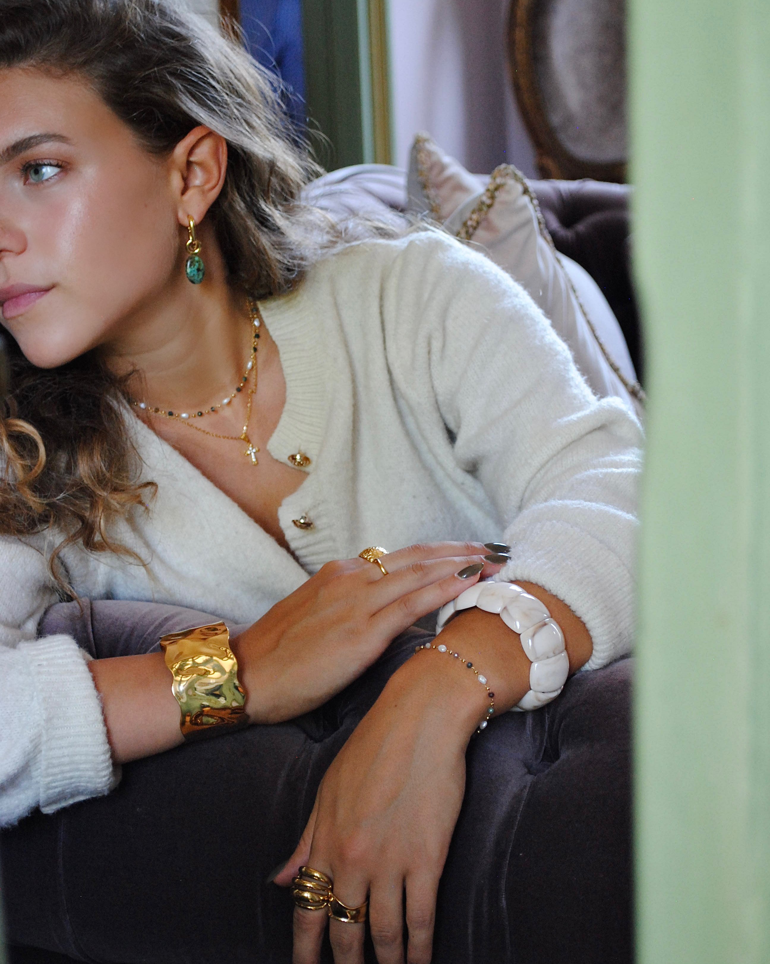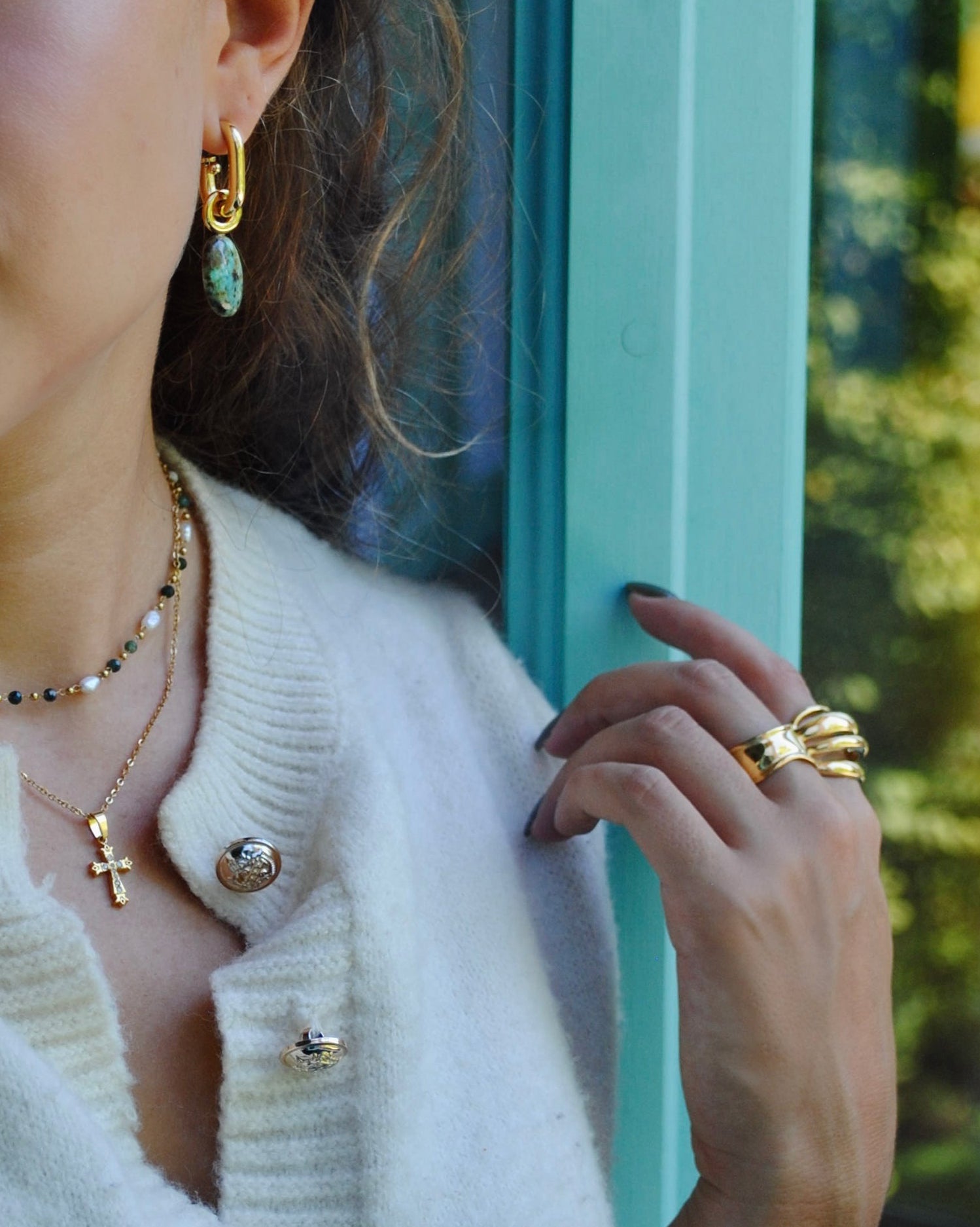 Les boucles d’oreilles Catherine associent des maillons dorés modernes à une pierre facettée, créant un contraste élégant et raffiné. Un bijou unique qui allie force et délicatesse avec subtilité.