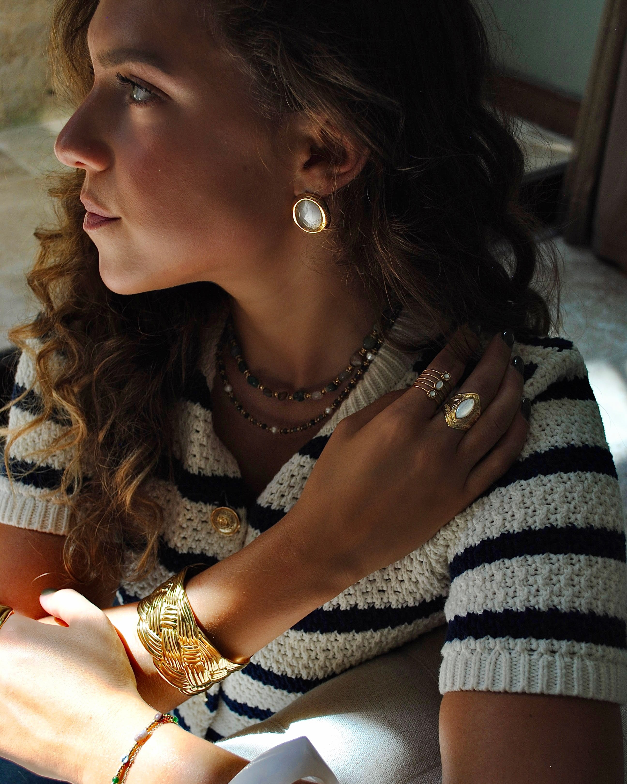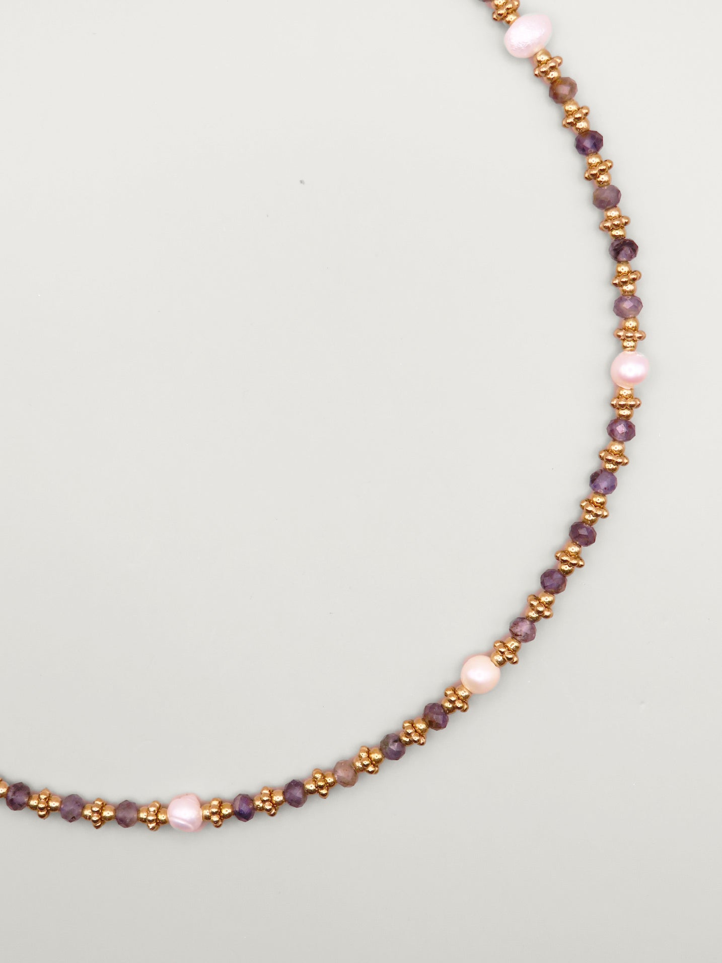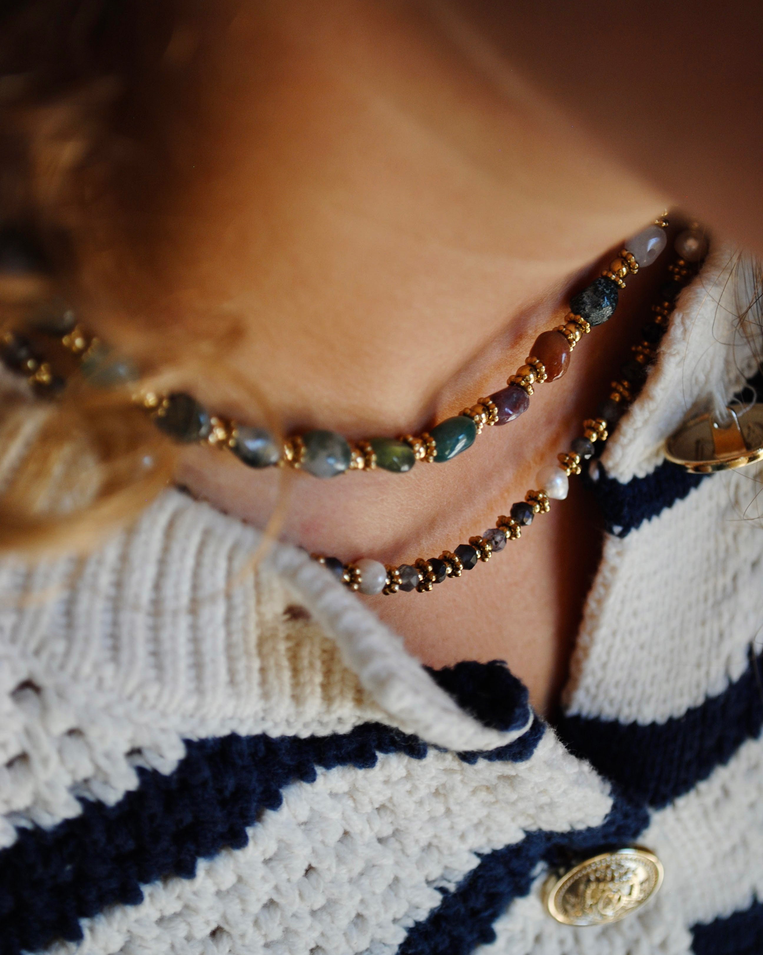 Le collier Jeanine associe perles en acier, perles d'eau douce et pierres naturelles dans un équilibre subtil. Un bijou raffiné qui sublime le cou avec discrétion et élégance.