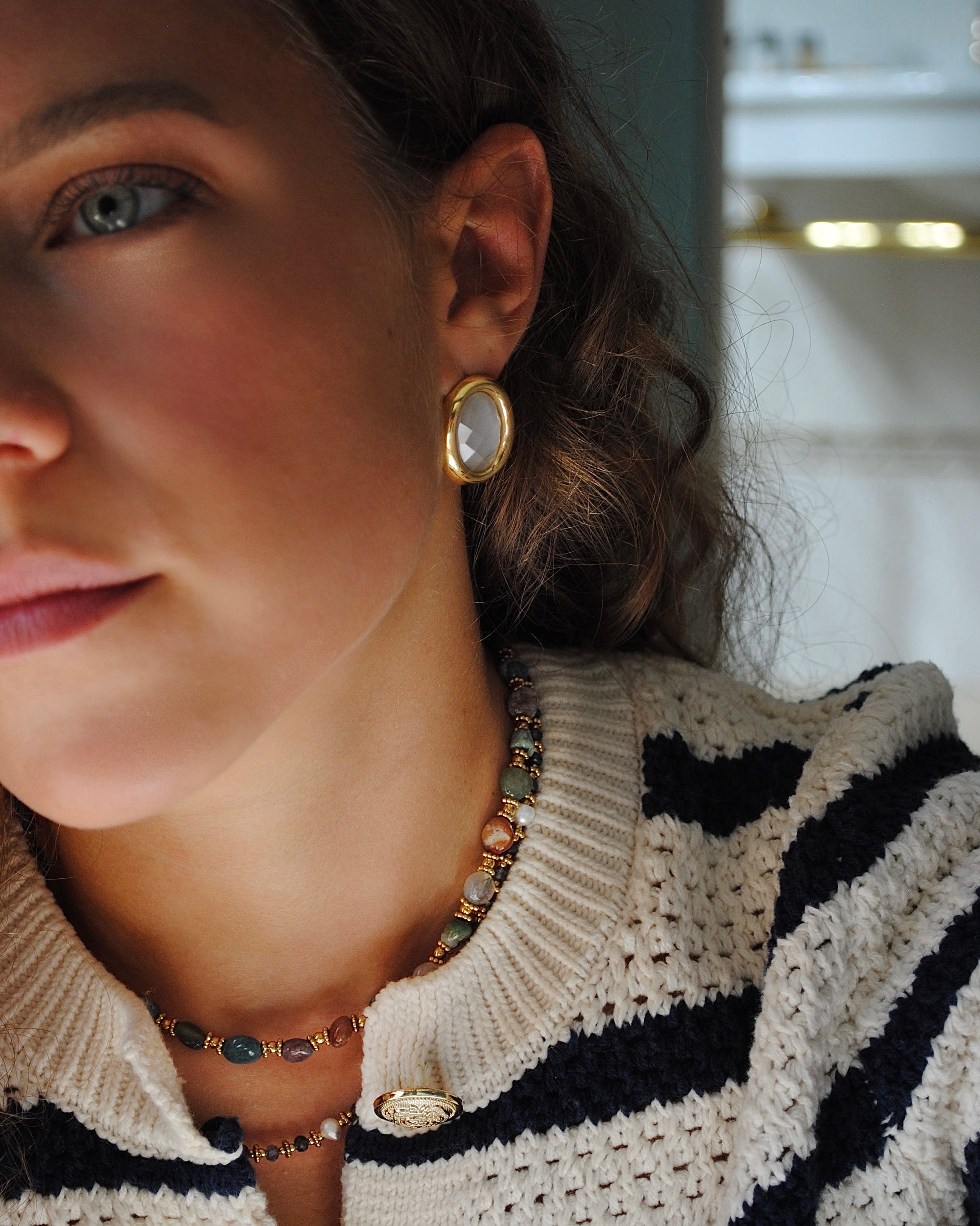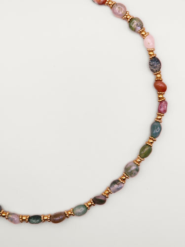 Le collier Pierrette associe modernité et authenticité grâce à ses pierres naturelles colorées et ses détails dorés. Un accessoire tendance et élégant, idéal pour donner caractère et style à vos tenues.