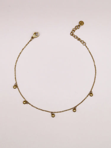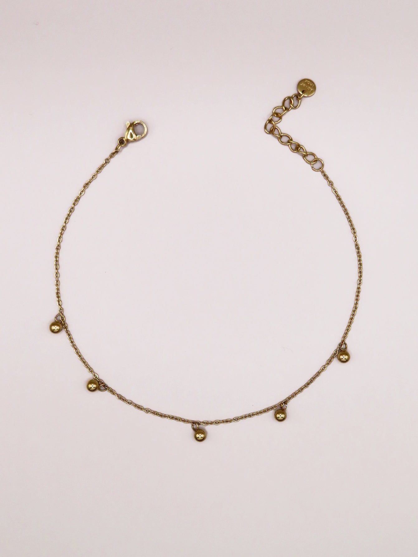 Chevillère en acier inoxydable, taille ajustable, hypoallergénique, résiste à l'eau et ne noircit pas. Disponible en coloris doré.