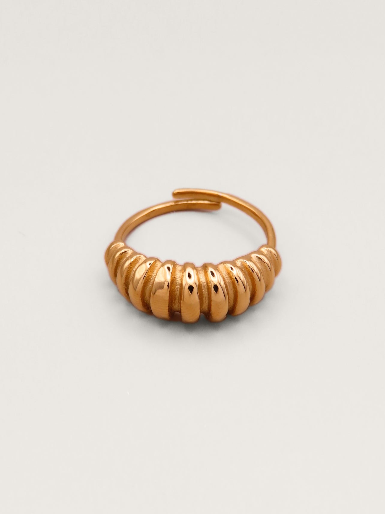 Bague en acier inoxydable, taille ajustable : la bague se resserre et s'agrandit, hypoallergénique, résiste à l'eau et ne noircit pas. Disponible en coloris doré.